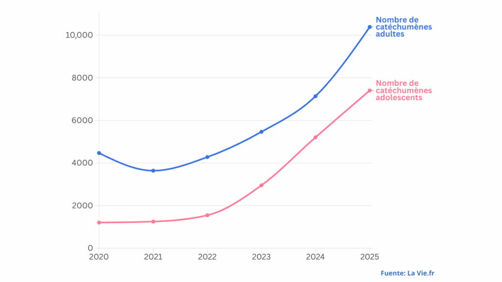 En cinco años, el número de bautizados en la Iglesia Católica se ha más que duplicado, tanto entre adultos como entre adolescentes. En 2020, 4.500 adultos se unieron a la comunidad católica, y hoy, la cifra ha ascendido a 10.000. Entre los jóvenes de 11 a 17 años, la cifra aumentó de 1.200 en 2020 a más de 7.400 en la actualidad.